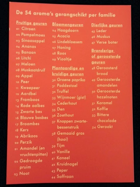Om te leren om geuren te herkennen gebruiken sommeliers soms een set met 50 geuren, deze zitten in kleine flesjes. Dennis had ook zo'n set meegenomen en er gingen een paar keer wat flesjes rond om geuren te herkennen. In de eerste ronde zat de geur van geroosterd brood, de meeste van onze tafel zaten wel in de rokerige hoek maar het brood werd door niemand herkend. Als je eenmaal weet wat het is, dan herken je het wel. De tweede was makkelijker: framboos, en dit werd dan ook door iedereen genoemd.